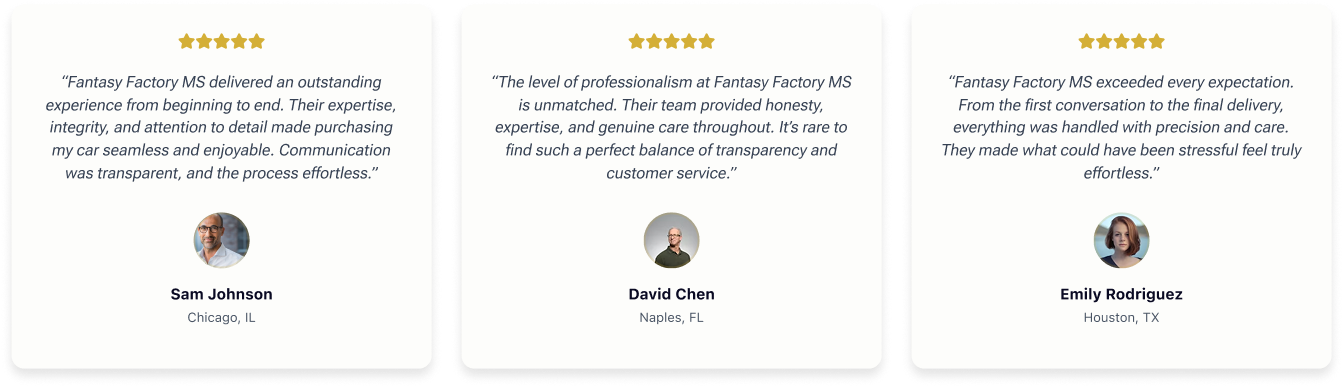 Fantasy Factory MS has built a reputation for trust and reliability, delivering over 5,000 vehicles to satisfied clients across the nation and around the world. With nearly 1,000 five-star reviews, our customers say it best.